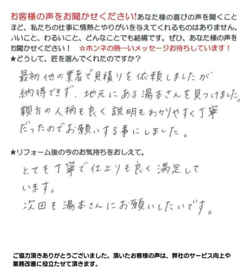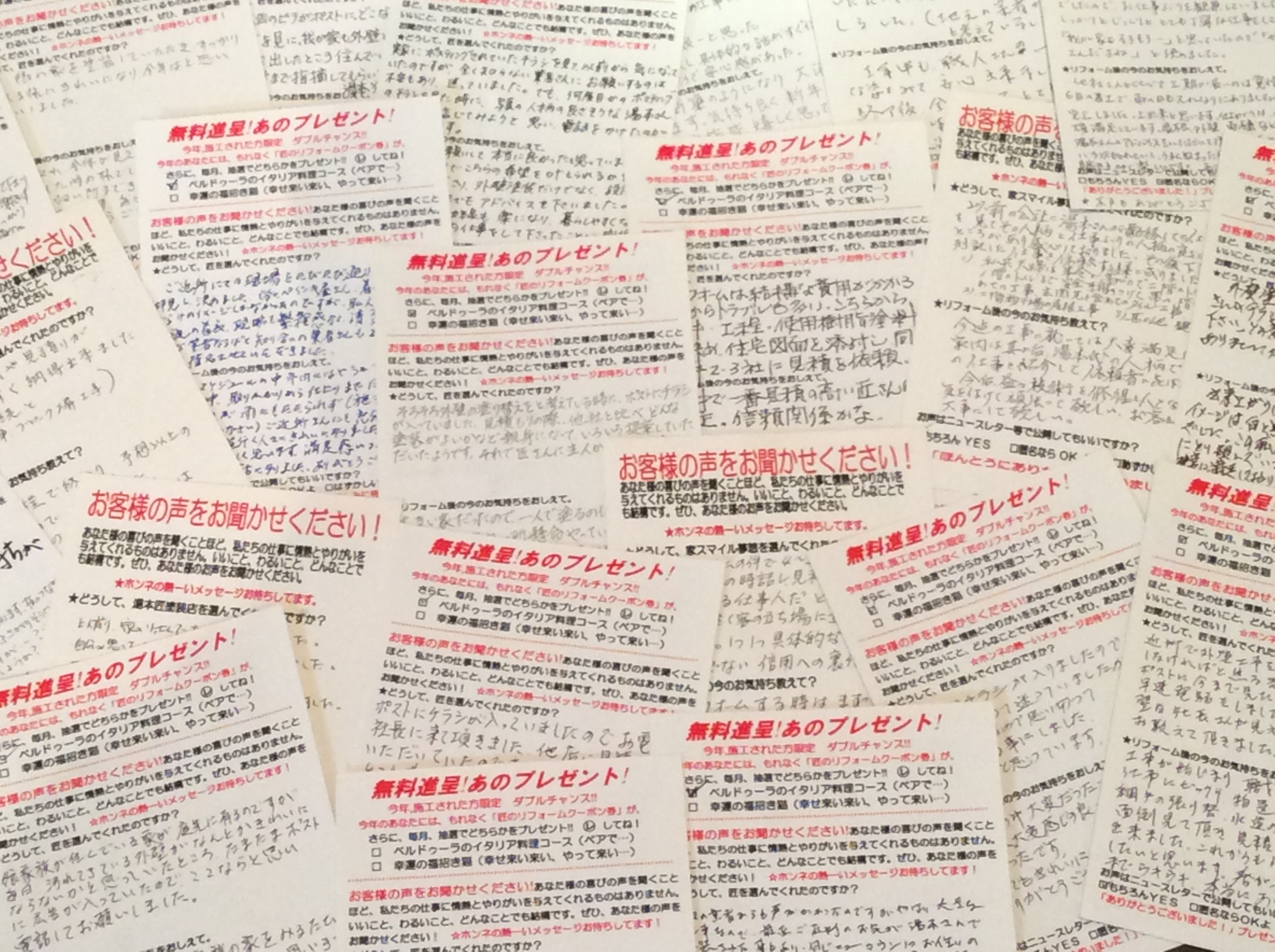 当社では、施工が終わった後に、お客様からアンケートをいただいています。