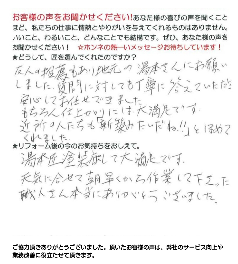 友人の推薦もあり地元の湯本さんにお願いしました。質問に対しても丁寧に答えていただき安心してお任せできました。もちろん仕上がりには大満足です。近所の人たちも「新築みたいだね!!」とほめてくれました。