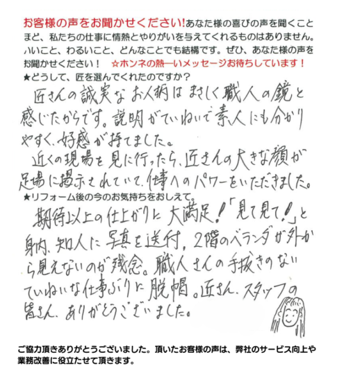 お客様の声東松山市 O様 Q.どうして湯本匠塗装店を選んでくれたのですか? 最初からこちらに決めていました。我家もそろそろ塗替え時かなと思っている頃、チラシが目に止まりました。犬の散歩中に匠の現場を通り掛かりお話をしましたね。印...